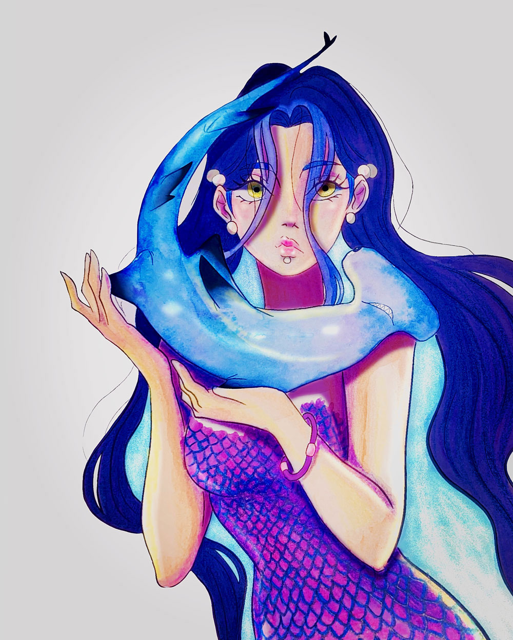 Cette illustration est la toute première où je mélange mes techniques, vous pouvez voir une base d’aquarelle avec un fond numérique. Elle fait d’elle la première d’une longue série d’illustrations.