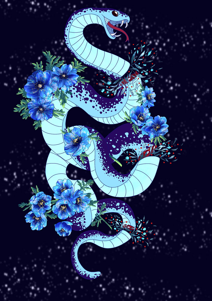 Ayant moi-même un serpent en tatouage, j’ai voulu créer une série d’illustrations à leurs effigies avec le thème des saisons. Le serpent est dans mon top 3 de mes animaux préférés.